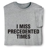Note: The “precedented times” shirt is, I believe, from Signals.com, which offers a cornucopia of shirts with different themes, in addition to other merchandise. If it’s not from Signals, it’s from one (or more than one) of the numerous resellers of merchandise that you can find on multiple sites.